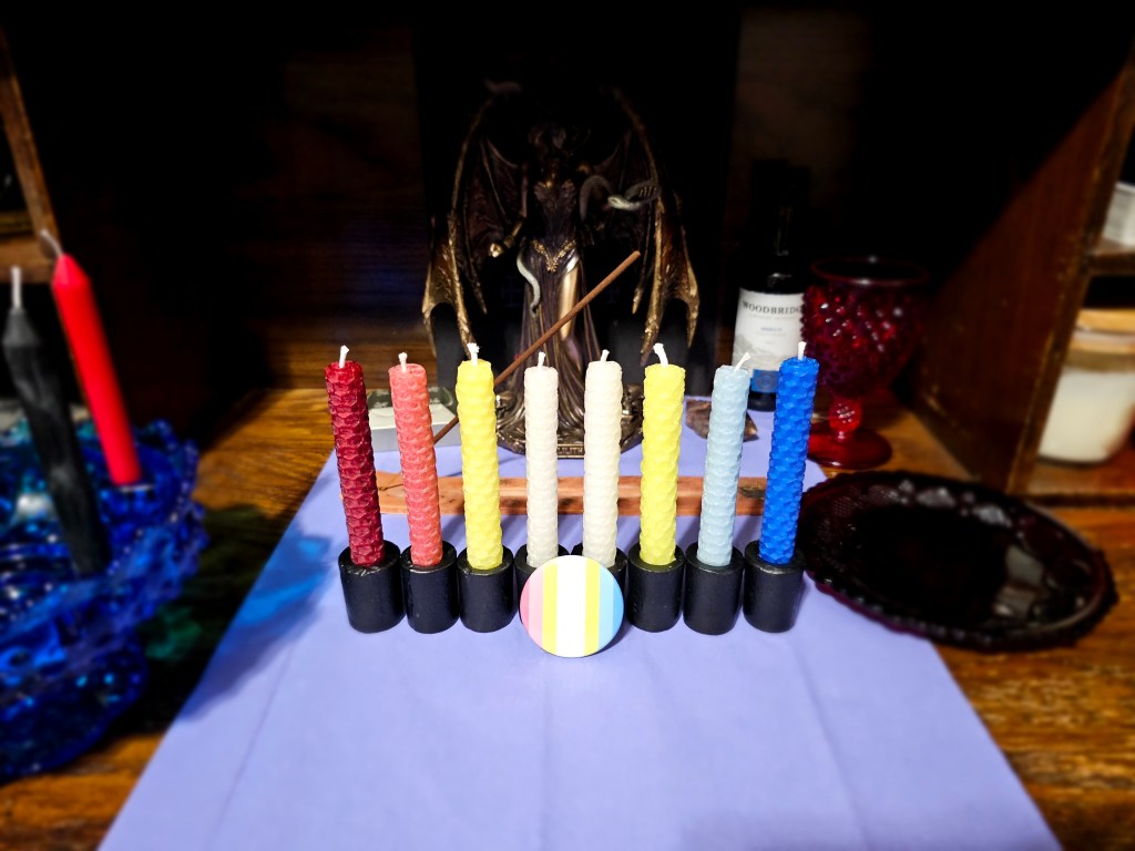 [Image description for the visually impaired: Eight beeswax candles, each 4″ tall and 0.5″ in diameter, stand in a row in cast iron candle holders. These candles are arranged by color in the pattern of the MAP flag. Behind these candles is a stick of incense held diagonally in a wooden incense holder. Behind the incense stick is a 9″ tall, cold cast resin statuette of Lilith. All these objects are on lavender-colored tissue paper on a wooden desk with its own backing. A few other small objects are also on the desk.]